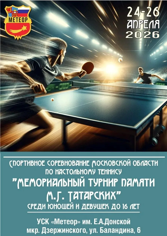Приглашаем вас посетить Спортивное соревнование Московской области по настольному теннису "Мемориальный турнир памяти М. Г. Татарских" - состязание, которое объединяет талант, волю к победе и уважение к традициям отечественного спорта.